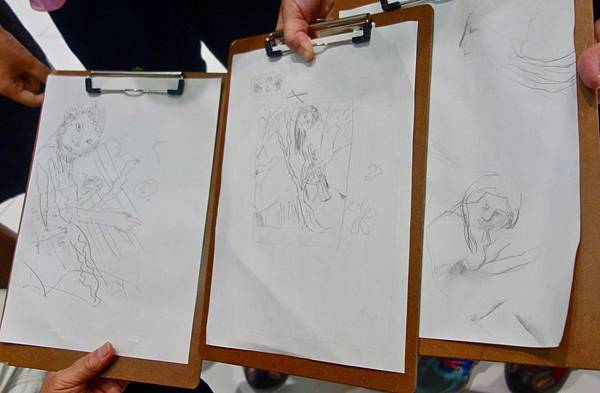 由左至右分別是大學生代表梅西(沒學過畫),小學生代表QQ(設計師後代),國中生代表狗蛋(某國中美術班)。