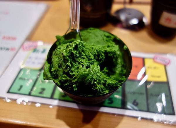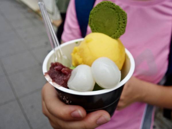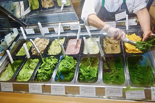 當然不是每個人都能接受那麼強烈抹茶味的冰淇淋,因此它分成七個等級,1號大概就是市面上的濃度,數字越大就越濃厚,7號則是放了三倍的抹茶!我當然點了七號,雖然比較貴,但怎能不制霸世界一的抹茶冰淇淋呢?味道真的非常濃郁,但帶有點苦澀,對抹茶控的人來說還好,像我就認為一般抹茶冰淇淋的甜度太高,七號對我來說就剛好,但對湯胖來說,他就認為太苦了不好吃,他認為三號最剛好,夠濃厚,甜度也剛好。我跟Sunny在台灣吃過焙茶口味的,蠻喜歡它的香味,在這裡也點了一份,也是很香濃。爸點的玄米茶口味也很棒。